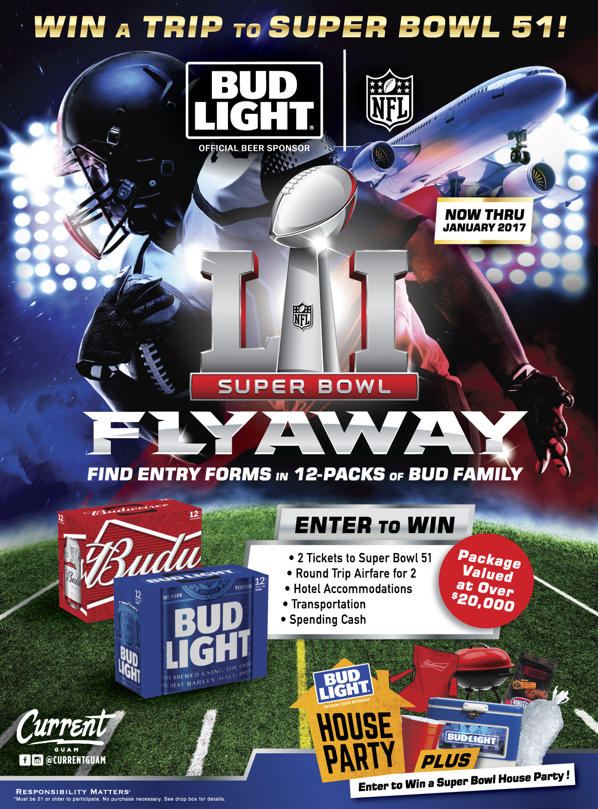 Bud Light presents the Super Bowl 51 Flyaway! From now until January 2017, purchase 12-packs of Bud Family to receive an entry form for a chance to win an all-expense paid trip to Super Bowl LI in Houston, Texas! Plus be entered to win a Bud Light House Party including Grill, Cooler, Beach Chairs, Ice, Meat and much more!