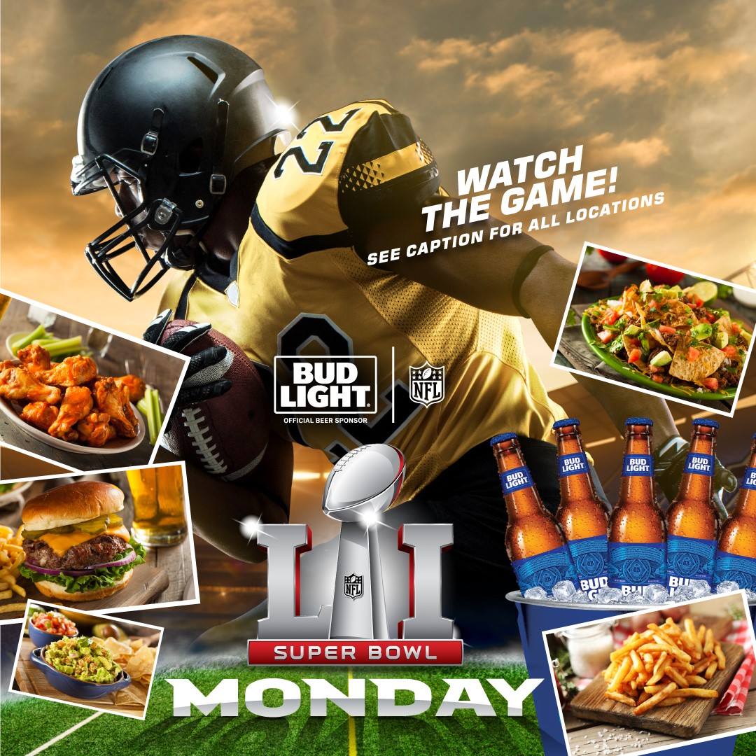 The game that we have been waiting for is here! Super Bowl 51 is happening Monday, Feb 6th @ 9:30 AM. Catch all of the action live with Bud Light, the official beer sponsor of the NFL! Win awesome Bud Light prizes when you purchase Bud Family buckets! Plus you can win $50,000 in cash when a big play happens! All going down at: