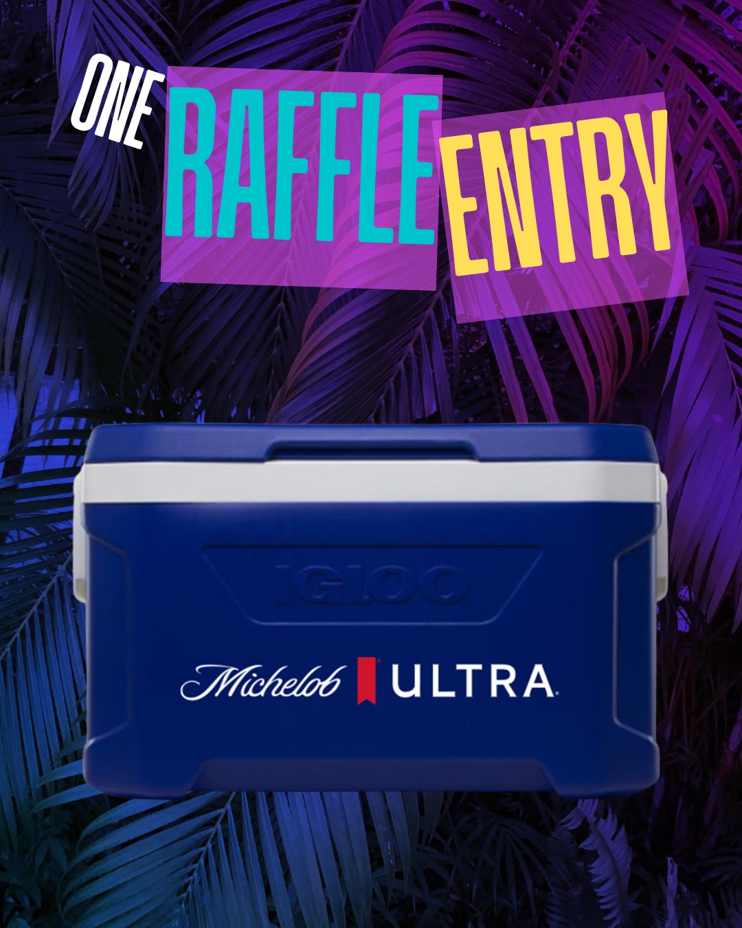 ONE RAFFLE ENTRY ONLY. This Michelob Ultra Igloo 50 QT Cooler keeps your drinks cold for hours with premium insulation and durable construction. Its spacious interior and easy-transport design make it ideal for parties, beach trips, and all-day adventures.